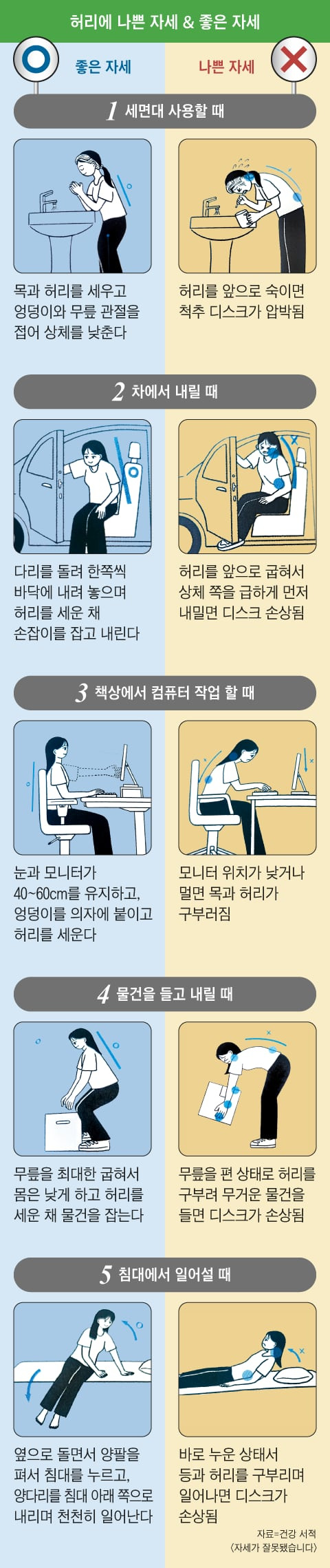 많은 이가 요통을 호소하면서도 일상생활에서 자기도 모르게 허리를 구부리는 어정쩡한 자세로 산다. 자신의 삐뚤어진 몸 습관을 점검해 봐야 한다(허리 건강 체크 리스트 참조).