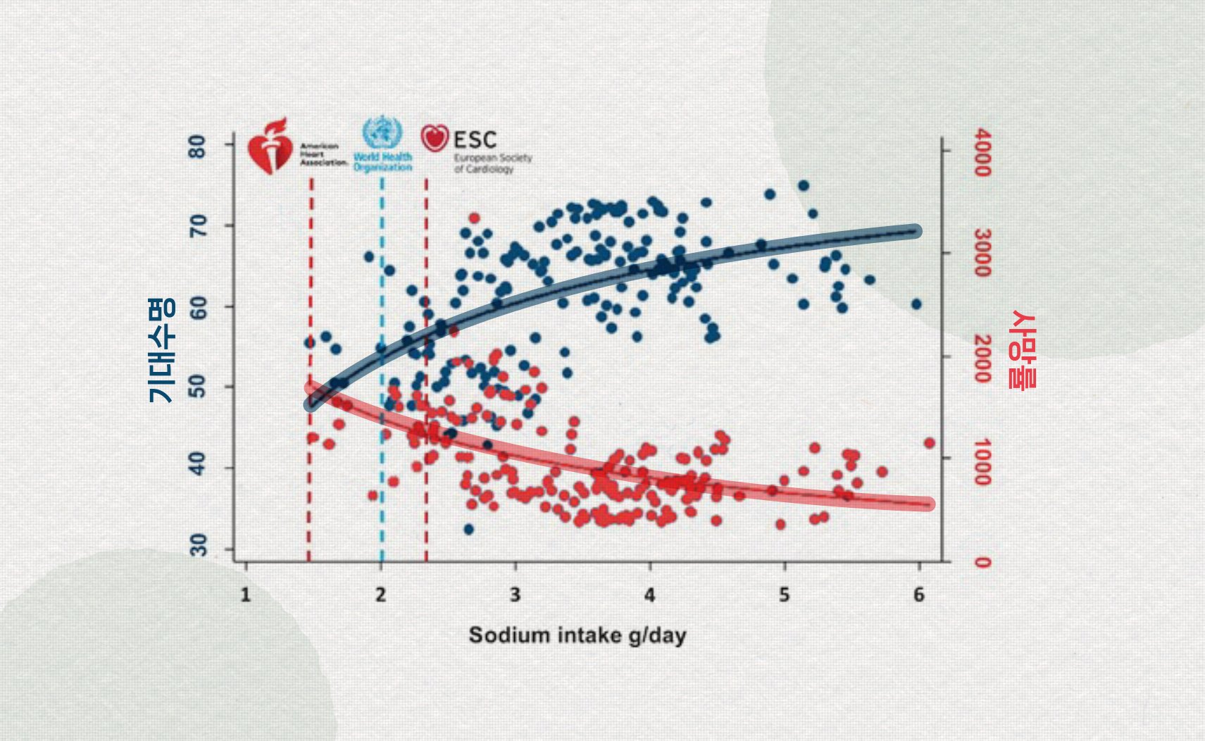 나트륨 섭취량을 1800㎎ 이하로 줄이면 심혈관 사건 발생 위험이 30~40% 정도 줄어든다는 게 또렷이 나오고요.
