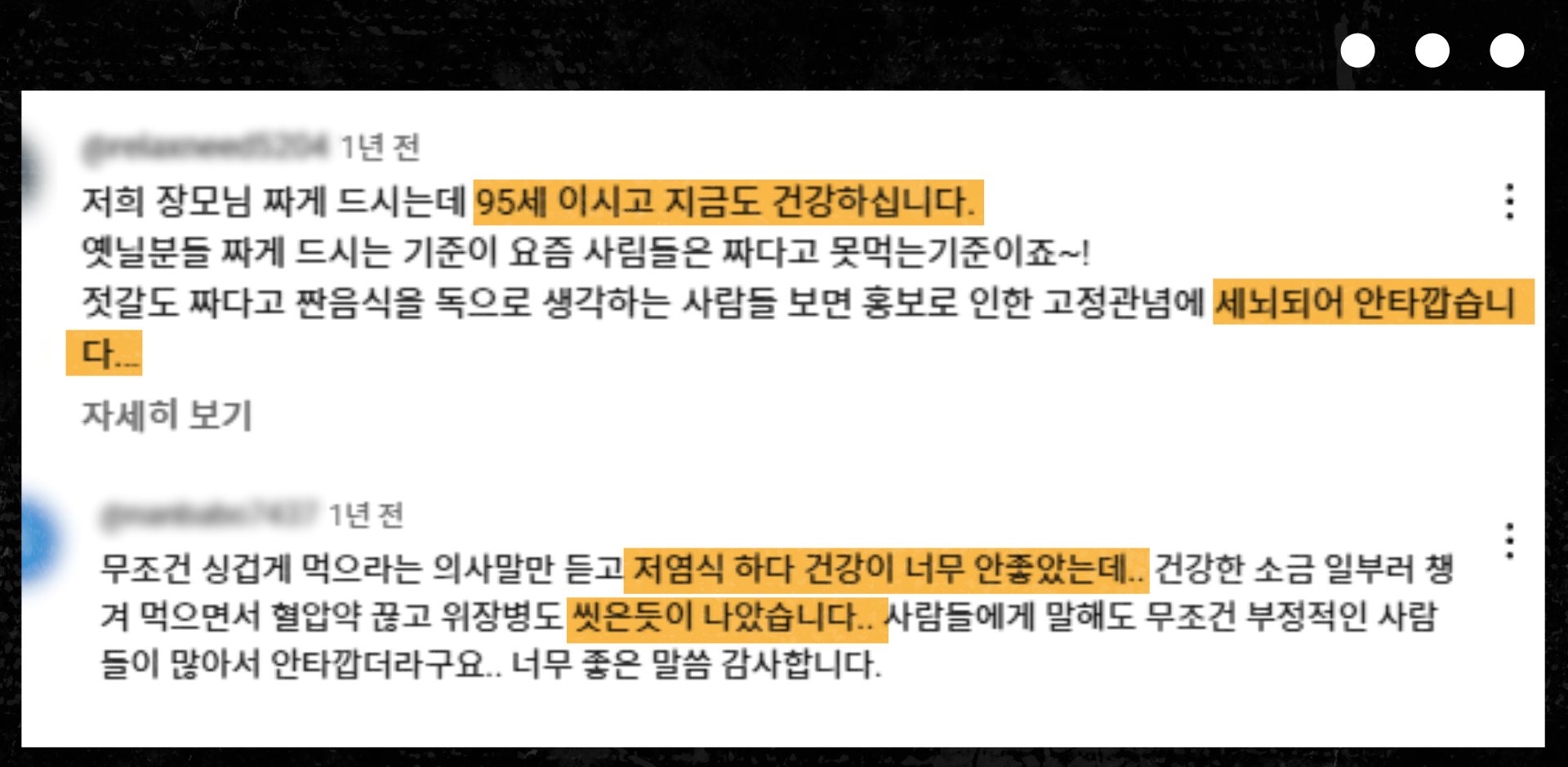 ‘소금, 나트륨 이렇게 먹으라’고 하는 유튜브 영상에 달린 댓글입니다.