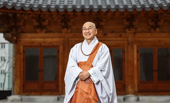법륜 스님이 정토사회문화회관 옥상에 있는 법당 앞에 서 있다. 법륜 스님은 “불교에서 가장 중요한 게 자각이다. 이 자각이 일어나게끔 하는 게 물음이다”고 말했다. 김종호 기자