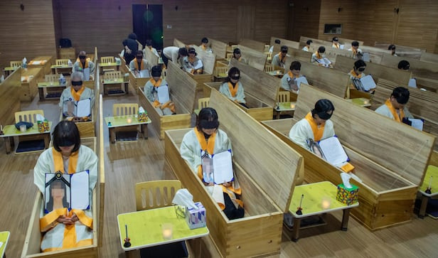 지난달 30일 충남 천안시 대한웰다잉협회에서 참가자들이 수의를 입고 관 속에 들어가는 체험을 하고 있다. 사회가 고령화되면서 '어떻게 하면 잘 죽는가'에 대한 관심이 높아지고 있다. / 조인원 기자