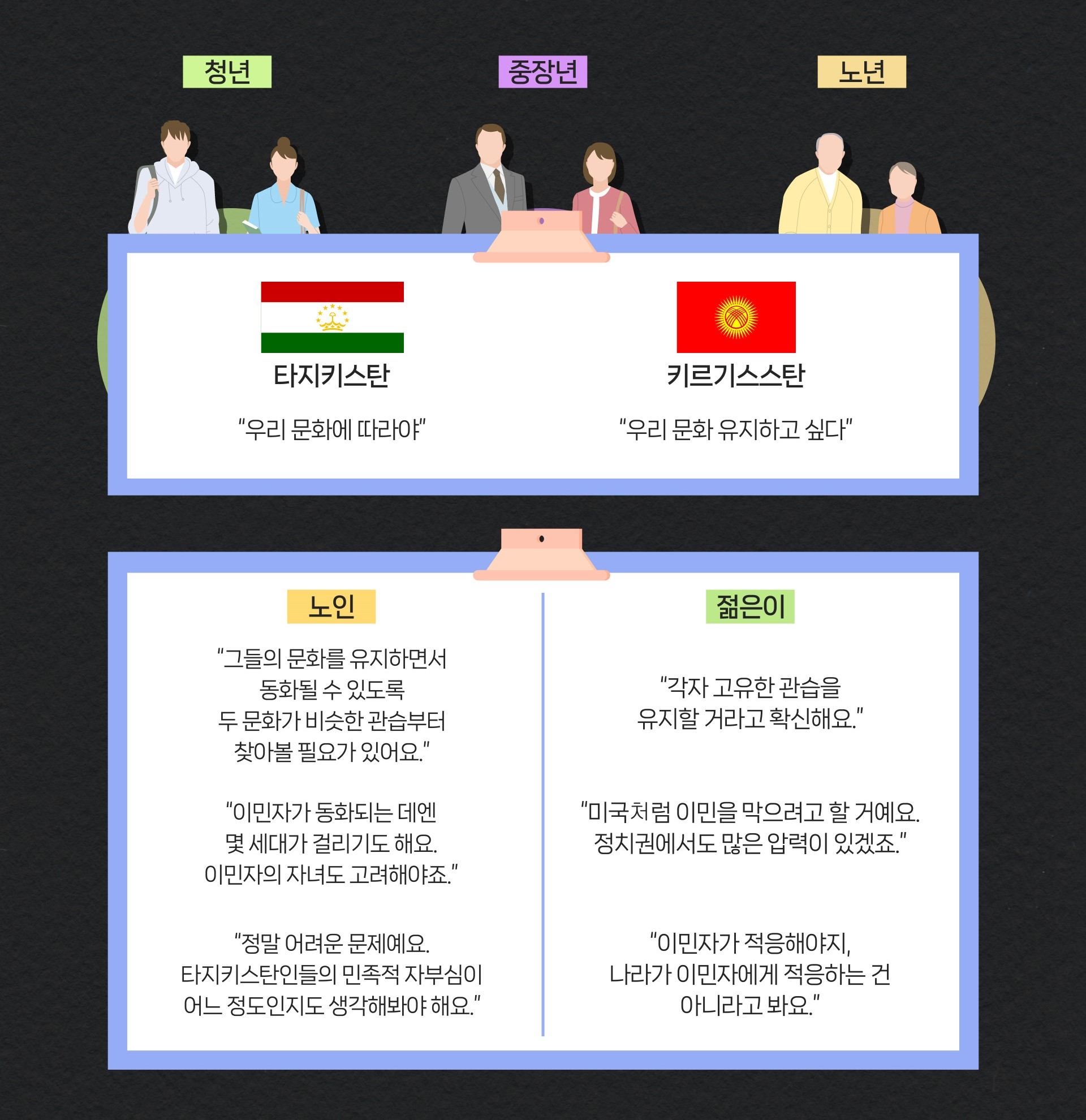 키르기스스탄 사람들은 자기 문화를 유지하려고 하는 반면, 타지키스탄인들은 자기 문화에 따르기를 바라는 거죠.