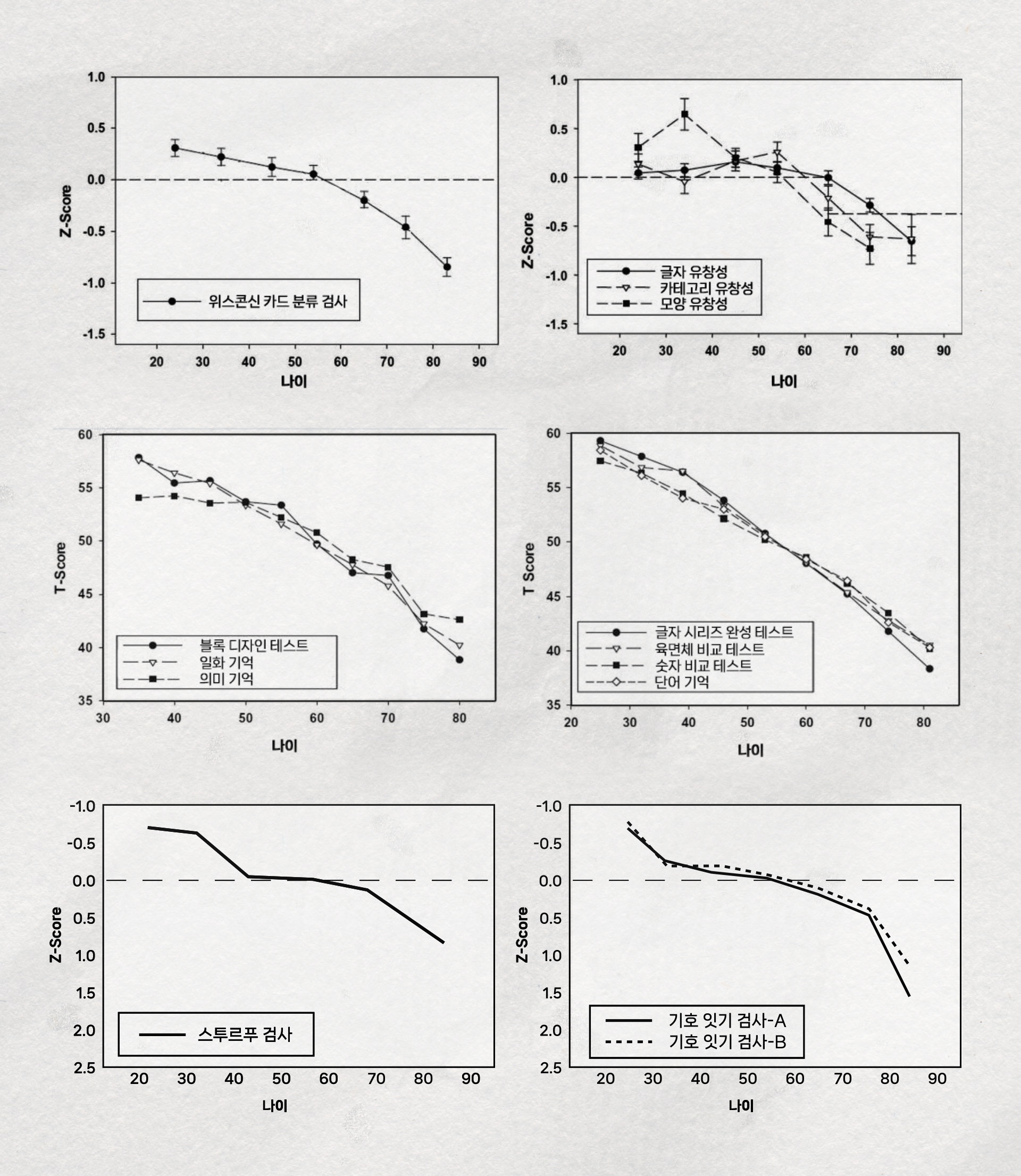 귀납 추리, 공간 방위, 지각 속도, 수리 능력, 언어 능력, 언어 기억 모두 60이 넘어가면서 추락합니다.