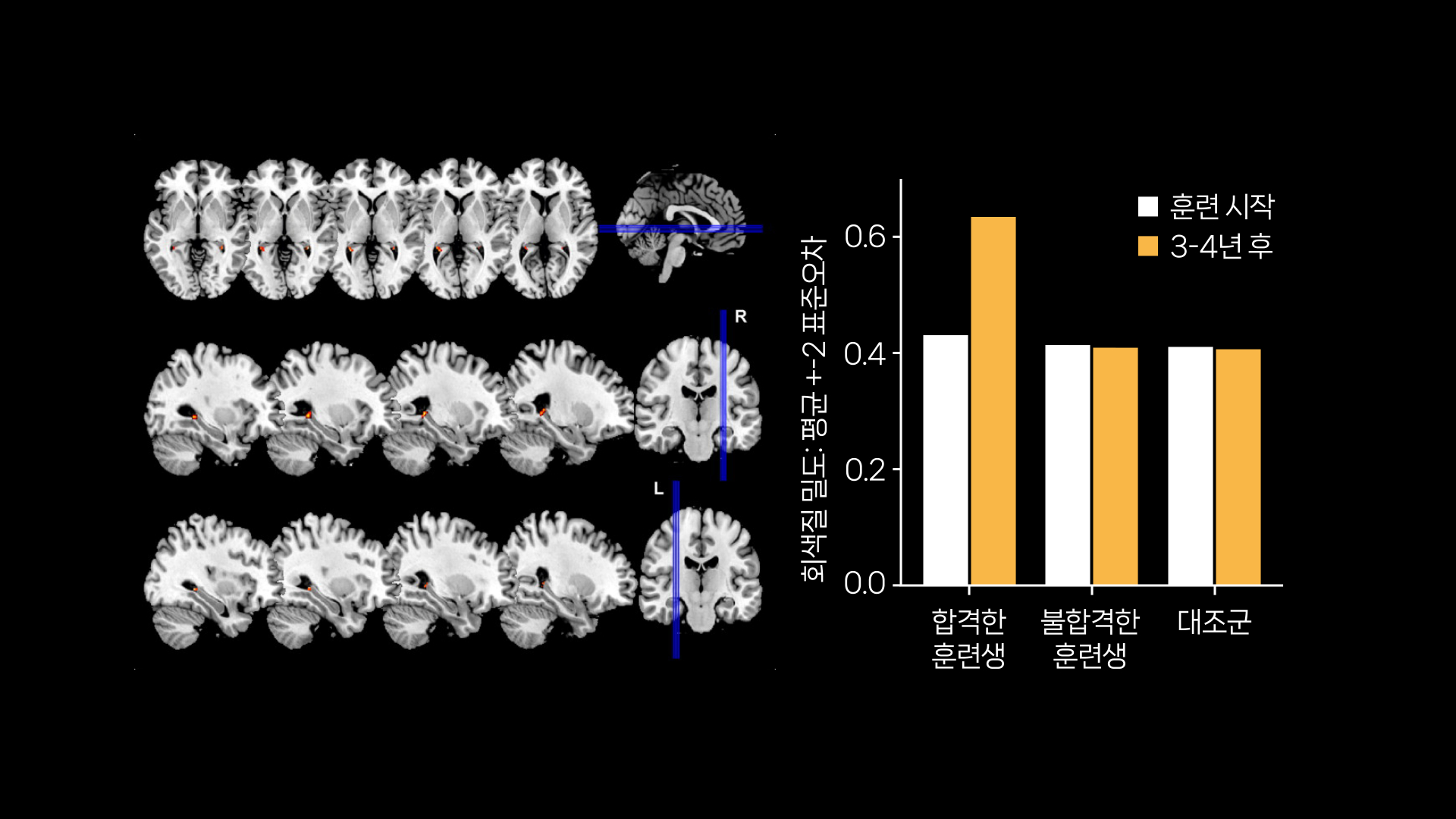이런 런던 택시 기사 합격생을 대상으로 뇌의 해마 회백질 부피를 측정했더니 다른 사람에 비해 현저히 증가했다는 사실이 나타났습니다.
