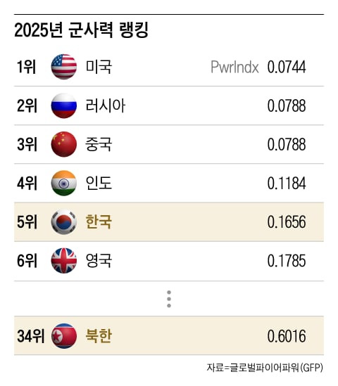 14일(현지시각) GFP가 최근 공개한 ’2025 군사력 랭킹(2025 Military Strength Ranking)‘에 따르면, 한국은 평가에서 작년과 같은 5위를 유지했다.