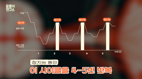박종석: 일반적으로 꿈의 단계가 있는데요. 얕은 수면에 해당하는 1단계와 2단계, 그리고 깊은 수면인 서파수면이 있는 3, 4단계가 있습니다. 이를 지나면 다시 얕은 수면으로 돌아오고, 마지막에 렘수면(REM Sleep)이 옵니다. 이 주기가 약 1시간 반(90분) 정도 걸리고, 우리는 이 과정을 한밤에 4~5번 정도 반복합니다. 이 렘수면에서 꿈을 꿀 기회가 생깁니다. 렘수면의 길이와 효율은 사람마다 다른데, 이 효율은 개인의 나이, 인지 기능, 그리고 정서적 상태에 영향을 받는다고 볼 수 있습니다.