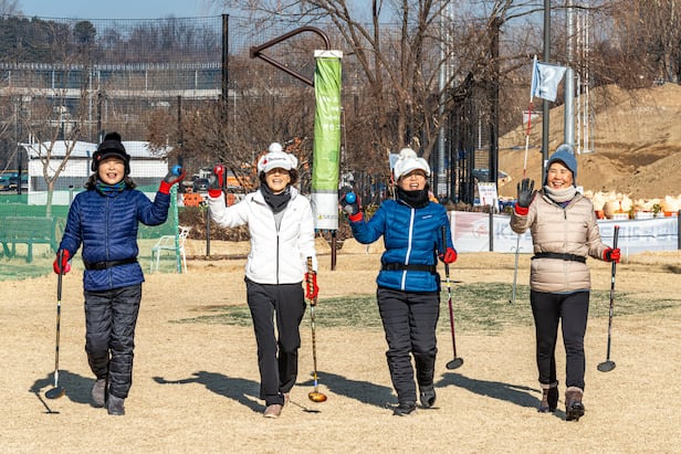1월의 추운 날씨에도 파크골프인들의 열정은 식지 않는다. 지난 23일 서울 영등포구 파크골프 동호회원들이 공과 채를 들고 웃고 있다. / 임화승 영상미디어 기자