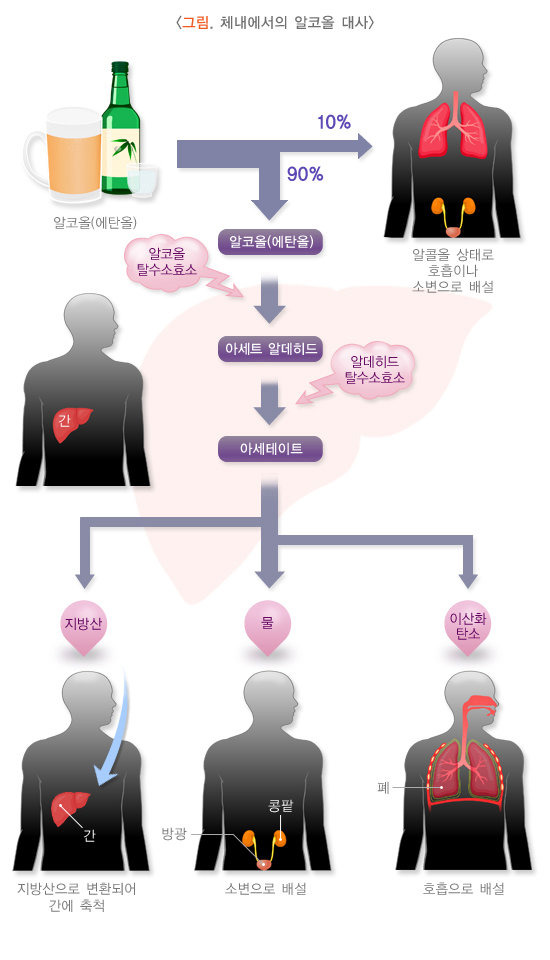 막걸리, 소주, 와인, 위스키, 사케…. 어떤 술을 마시든 몸 안의 효소는 체내 알코올(화학적으로는 에탄올)을 대사하는 작업을 시작한다. 이 과정의 대부분은 간에서 이루어진다.
