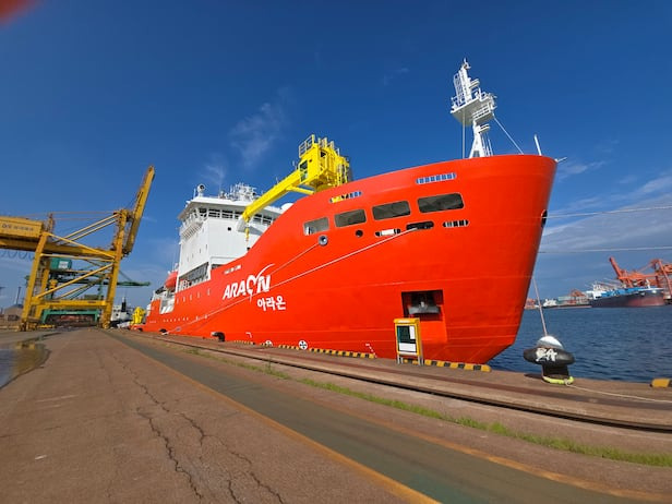 시험 운항을 앞두고 포항 신항에 정박해 있는 국내 유일의 쇄빙연구선 '아라온호'의 모습./포항=홍아름 기자