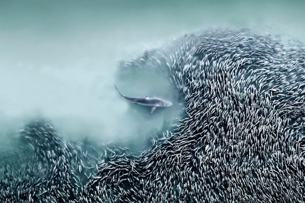 작가는 드론을 이용해 동네 해안에서 불과 150m 떨어진 바다에서 혹등고래가 수면으로 올라와 공기를 들이마신 뒤 다시 바다 밑으로 잠수하는 순간을 포착했다. 바다의 포식자 스피너 상어가 청어류 일종인 멘헤이든 떼 사이를 헤집고 들어가는 장면도 드론 카메라에 담겼다. ‘또 다른 세상(another world)’이란 작품에선 소코가오리들이 대열을 이뤄 먹잇감에 몰래 접근하는 모습을 담았다. 소코가오리들이 잘 정렬된 대형을 이뤄 이동하며 해저의 모래를 휘젓는 모습도 ‘콘체르토(Concerto·협주곡)’라는 작품에 담겨 있다. 작가는 “새의 눈높이에서 독특한 주제와 순간을 찾아다니는 일은 정말 흥미진진하다”며 “항공 사진은 아직 발굴되지 않은 탐구할 영역이며 많은 가능성을 제시하고 있다”고 말했다.