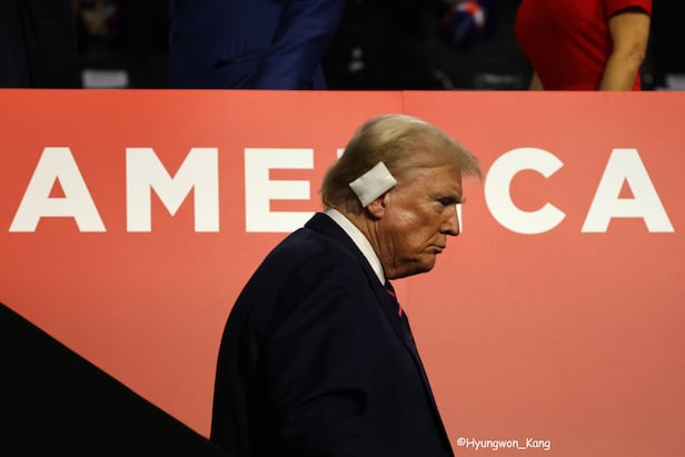 2024년 7월 위스콘신주 밀워키에서 열린 공화당 전당대회에서 귀에 붕대를 붙인 채 걸어가는 트럼프. /강형원 포토저널리스트