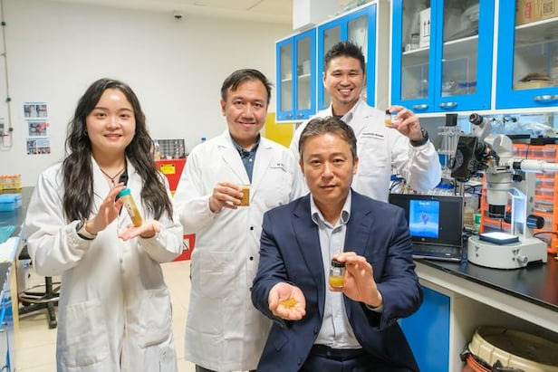 조남준 난양공대 재료과학·공학과 교수(오른쪽)와 연구진이 손에 꽃가루 선크림이 담긴 병을 들고 있다./NTU