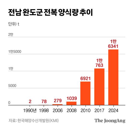 축구장(7140㎡) 4만8860개 크기인 완도 양식장(3만4887㏊)에서는 전복과 함께 김·미역·다시마 등 해조류(海藻類)가 한 해 88만여t 이 생산된다. 전국 해조류 생산량의 50% 수준이다. 이중 전복 가두리는 2005년 236㏊ 규모에서 현재 3093㏊로 20년 새 13배 이상 늘어났다.