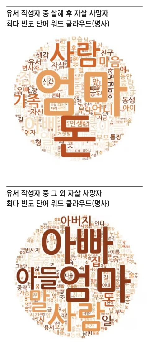 자살 사망자들의 유서에서 가장 많이 등장하는 명사는 ‘엄마, 어머니, 어머님’, ‘아빠, 아버지’와 같이 가족과 관련된 말인 것으로 나타났다.