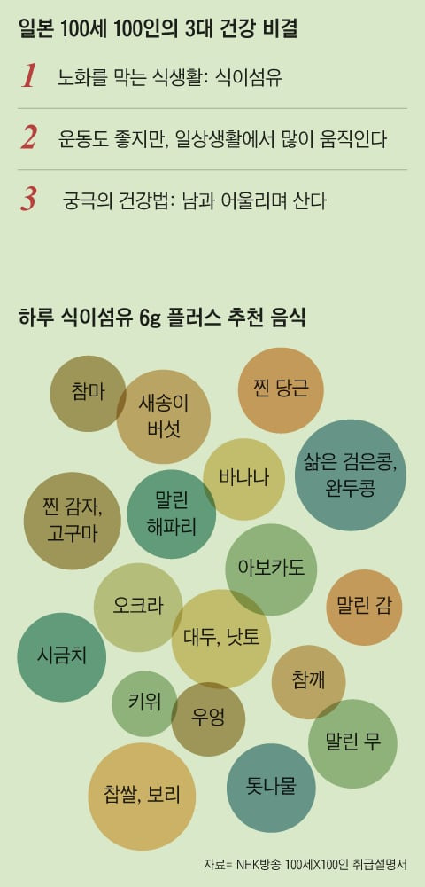 세계 최고 장수 국가 일본의 공영방송 NHK는 2025년 방송 100주년을 맞아, 지난해 말 100세인 100명을 찾아가 그들의 건강 비결을 분석한 내용을 다룬 특집 방송을 했다. 프로그램 타이틀은 100세100명, 1만년의 건강 파워 취급 설명서이다. NHK방송은 건강한 100세인들이 뭘 먹고 있는지, 어떤 생활 습관을 갖고 있는지, 날마다 무엇을 생각하고 있는지 등을 조사해서 공통적인 건강 장수 비결 3가지를 찾아냈다.