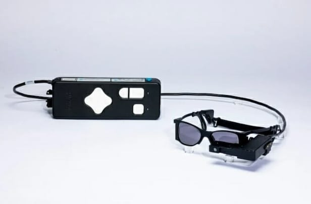 전자칩을 눈에 이식한 환자들이 함께 착용하는 특수안경과 포켓 컴퓨터. 이 장치를 활용하면 시력을 잃었던 이들도 앞을 볼 수 있다. /사이언스 코퍼레이션