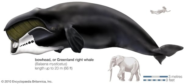 북극고래와 인간, 코끼리의 크기 비교. 북극고래는 몸길이가 15~24m이고 몸무게는 80t을 넘는다./브리태니커