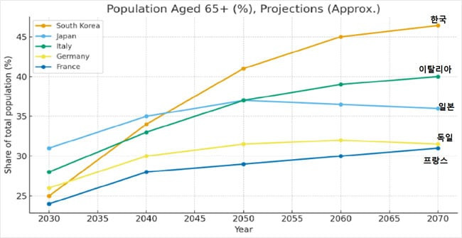 국제연합(UN)의 ‘2024 세계인구전망’ 예상치를 종합하면, 우리나라 65세 이상 비율은 2040년에 33.9%로 높아져 일본의 34.8%와 사실상 같아질 전망이다. 2045년 무렵에는 38%를 넘어서며 일본(36%)을 추월할 가능성이 크다. 출산율 급등과 같은 변수가 없다면, 2050년 43.3%, 2060년 45.2%, 2070년 46.4%로 치솟는다. 경제활동 세대 1명이 노인 1명 이상을 떠받치는 사회가 되는 셈이다.