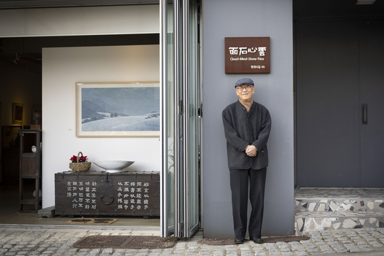 '구름의 마음, 돌의 얼굴'. 김용원이 갤러리 '운심석면' 현판 앞에서 기념촬영을 하고 있다. 장진영 기자