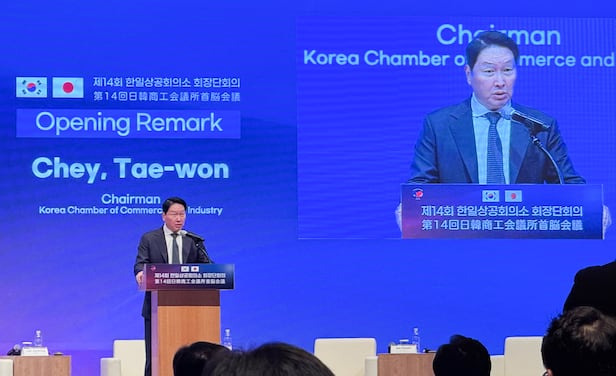 최태원 대한상공회의소 회장 겸 SK회장이 8일 제주에서 열린 한일 상공회의소 회장단 회의에서 한국과 일본 양국 간 경제협력의 구체적 실험 방안을 제안했다. 밖으로는 급변하는 글로벌 통상 환경과 커지는 중국, 안으로는 저출생·고령화 등 공통 과제를 안고 있는 양국이 경제협력을 통해 함께 대응해야 한다는 주장이다.