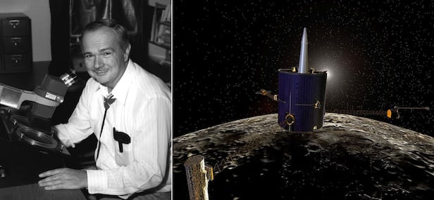 미국의 달 탐사선 루나 프로스펙터(오른쪽)는 19개월 임무를 마치고 1999년 7월 31일 달의 남극 근처에 충돌했다. 그 안에 미국의 지질학자인 유진 슈메이커(왼쪽)의 유해가 담긴 캡슐이 있었다./USGS, NASA