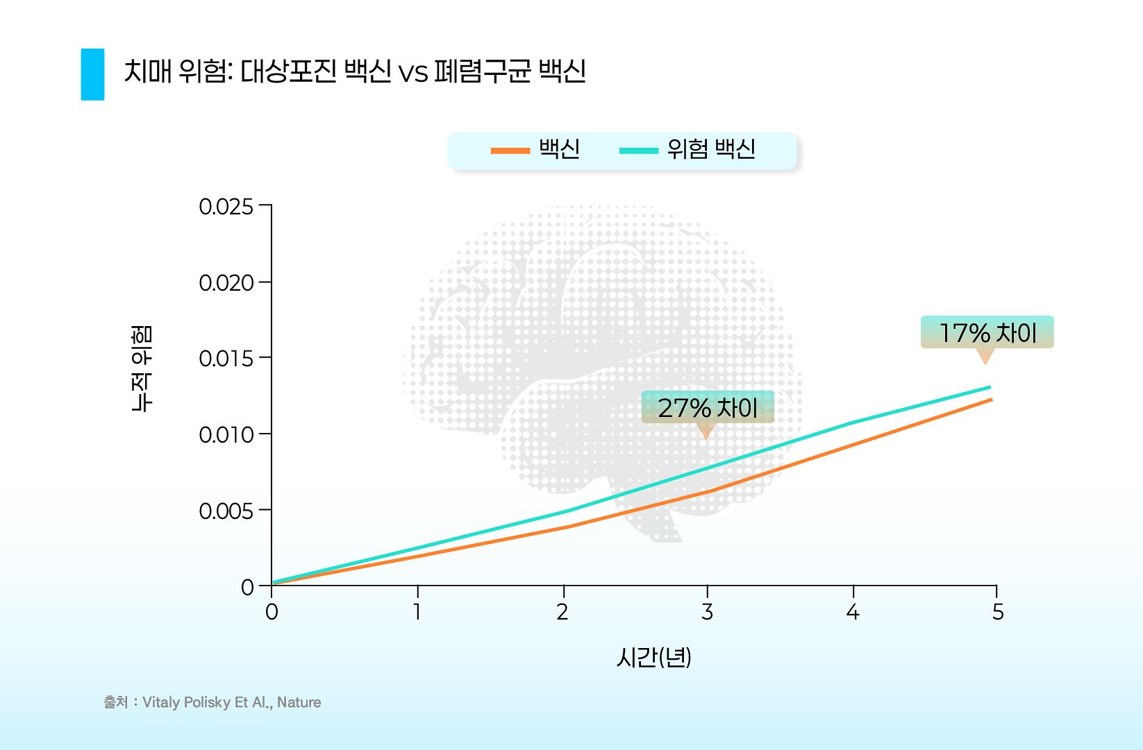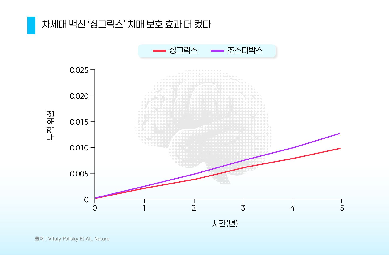 싱그릭스를 맞은 사람들은 대조군인 폐렴구균 백신을 맞은 사람에 비해 치매 위험이 현저히 낮아졌다. 특히 백신 접종 후 3년까지 보호 효과가 컸다. 박지은 그래픽.