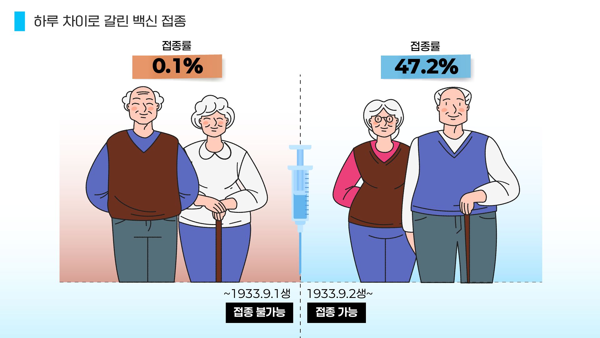웨일스 연구의 힘은 출생일 기준이라는 우연한 정책 덕분에, 거의 무작위시험처럼 백신 효과를 볼 수 있었다는 점이다. 고작 하루 차이로 백신 접종률도 큰 차이를 보였다. 이민서 그래픽.