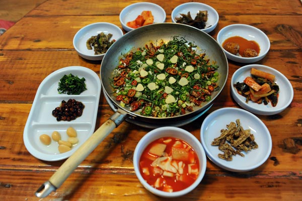 음식은 상다리가 휘어질 정도다. 적어도 12가지의 밑반찬이 나오는데 이는 제철음식을 이용한 것들이다. 하얀 자기 위에 올라간 반찬은 정갈하면서 먹음직스럽다. 젓갈이나 전, 나물 등 쌀밥과 어울리는 반찬들로 가득하다.
