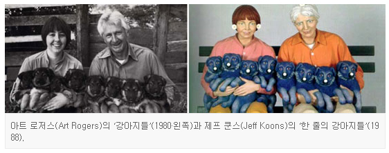 미국 현대미술에서 가장 문제적 작가로 꼽히는 제프 쿤스(59). 그는 88년 개인전에 내놓은 ‘한 줄의 강아지들’이라는 나무조각 작품 세 점을 36만7000달러에 팔았다. 작품 속의 부부가 똑 닮은 파란색 강아지 8마리를 품에 안고 미소를 짓는 화려한 색감의 작품이었다.