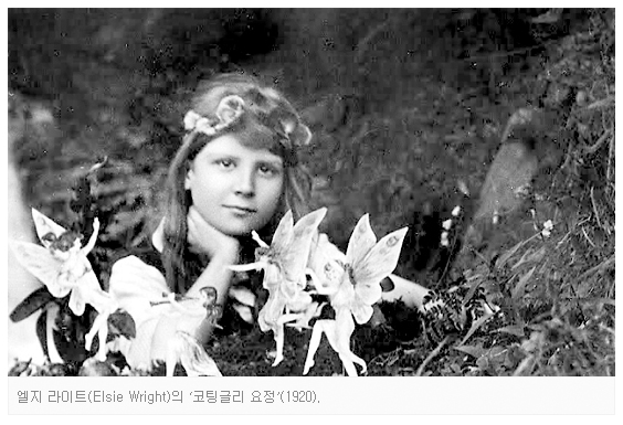 20년 여름 영국의 시골마을 코팅글리에 놀러온 소녀 프랜시스 그리피스(1908~86)와 사촌 언니 엘지 라이트(1901~88)는 어느 날 어른들에게 “들에서 놀다 요정을 만났다”고 말했다. 어른들은 그 말을 당연히 믿지 않았다. 어느 날 둘은 카메라로 몇 장의 사진을 찍어 왔고, 라이트의 아버지가 필름을 현상했다. 놀랍게도 사진엔 날개가 선명한 손바닥 만한 요정이 찍혀 있었다. 이 이야기는 셜록 홈스의 작가 아서 코난 도일에게까지 전해졌다. 초현실적 존재를 믿었던 도일은 사진을 보고 난 뒤 실제라고 확신했고, 그 이야기를 잡지에 발표했다. 요정에 사진에 포착됐다는 이야기는 영국 전역에 퍼졌고, 국가적 관심사로 떠올랐다. 당시 유령·텔레파시 등 신비적 현상에 대한 믿음이 유럽에 퍼져 있던 시기였다. 조작설도 제기됐지만 믿는 사람도 적지 않았다.