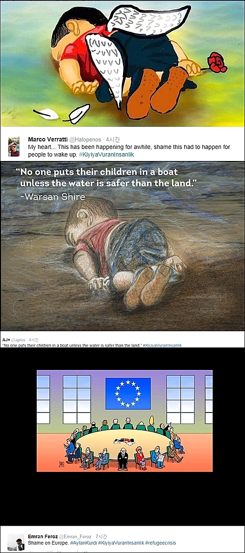 터키 도안 통신이 찍어 주요 외신이 보도한 아이의 마지막 모습이 담긴 사진은 페이스북과 트위터 등 소셜네트워킹서비스(SNS)를 통해 '파도에 휩쓸린 인도주의(#KiyiyaVuranInsanlik)'라는 해시태그와 함께 공유되고 있다고 BBC 등 언론이 3일 보도했다.