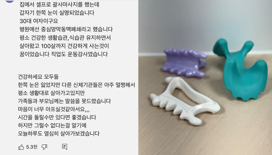 집에서 셀프로 괄사(마사지도구) 마사지를 했는데, 갑자기 한쪽 눈이 실명됐습니다. 100세까지 사는 게 꿈이었고, 직업도 운동 강사였습니다.