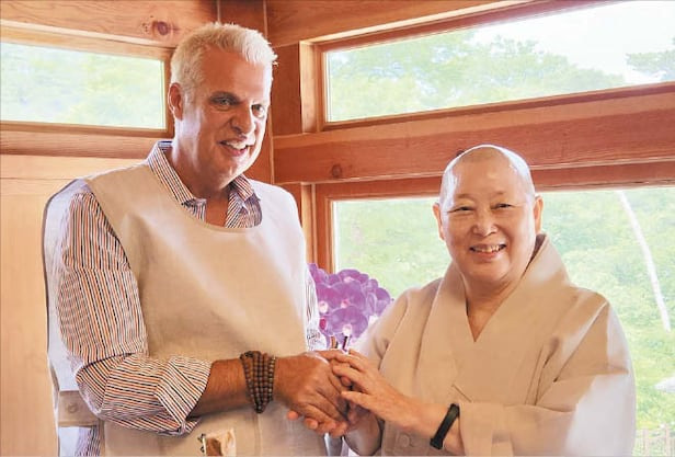 27일 인천 영종도의 한 호텔에서 만난 유명 셰프 에릭 리퍼트(60)는 왼쪽 손목에 찬 갈색 묵주를 만지작거리면서 말했다. 프랑스 출신 요리 거장인 그는 불교 신자다. 미국 뉴욕에서 미쉐린(미슐랭) 3스타 식당인 ‘르 베르나르댕’을 운영하고 있다. 지중해풍 해산물 요리를 전문으로 하는 프렌치 레스토랑인데, 김치와 사찰 음식에서 영감을 받은 메뉴를 개발해 뉴요커들에게 선보이고 있다. 틈만 나면 한국 사찰을 찾아 사찰 요리를 맛본 뒤 미국으로 돌아가 새 메뉴를 개발한다. 에릭은 이날 세계 최고 레스토랑을 선정하는 프랑스 미식(美食) 가이드 ‘라 리스트’(La Liste)와 한국·유럽 싱크탱크 키(KEY) 등이 주최한 글로벌 미식 포럼 ‘넥스트 가스트로노미 2025 코리아’에 참석하기 위해 방한했다.
