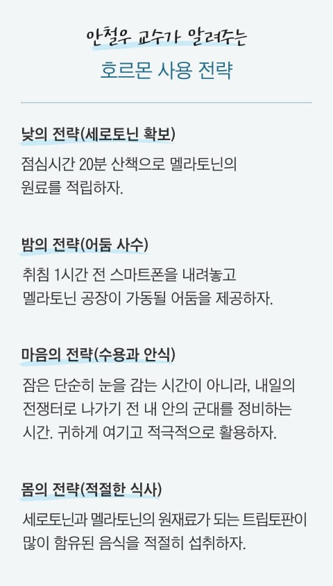 작업 환경의 변화, 일상의 변화는 몸에 변화를 일으켰다. 스마트폰과 모니터에서 나오는 블루 라이트는 멜라토닌 생성을 방해하는 일등 공신이다. 수면뿐만 아니라 항노화, 항산화의 보고로 증명된 멜라토닌이 줄면 건강한 삶을 유지할 수 없다.